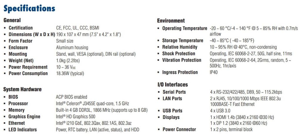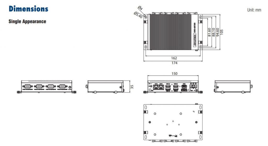 Der Advantech ESRP-CMS-UNO2372 ist ein kompakter und lüfterloser ThinClient, der mit modernen Videoanschlüssen wie HDMI & Displayport ausgestattet ist, die gleichzeitig & unabhängig voneinander funktionieren. Dazu kommen noch Anschlüsse wie USB 3.0, GbE und RS232 / 422 / 485 dazu. Durch das kleine und schmale Design lässt sich der ThinClient problemlos überall einsetzen, wo wenig Platz zur Verfügung steht. Der UNO2372 lässt sich problemlos an Monitore oder andere Geräte mit DIN-Rail oder VESA standard montieren.