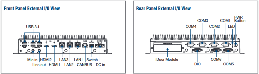 - 2x 2,5 GbE LAN, 1x GbE LAN, 6x USB 3.1, 6x RS-232/422/485, 2x HDMI und 2x CANBus
