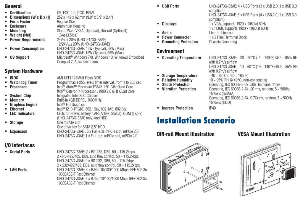 Der Advantech UNO-2473G Embedded-Automatisierungscomputer der Serie UNO-2000 ist ein lüfterloses und äußerst robustes Gerät für industrielle Anwendungen. Die Serie von dem Industriecomputer umfasst auch die iDoor-Technologie die Erweiterungen der Automatisierungsfunktionen wie Industrie-Feldbuskommunikation, Wi-Fi/3G und digitale E/A unterstützt, einschließlich Palm-, Small- und Regular-Size-Formfaktoren mit angegebenen Marktsegmenten in Bezug auf die Positionierung von Einstiegs-, hochwertigen und leistungsstarken Produkten.