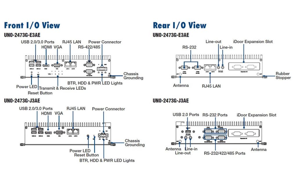 - 4/2 x GbE, 3 x USB 2.0 und 1 x USB 3.0/4 x USB 2.0 und 1 x USB 3.0, 2 x RS-232, 2 x RS-422/485 (E3AE), 2 x RS-232/422/485 (J3AE), 1 x VGA, 1 x HDMI, Audio