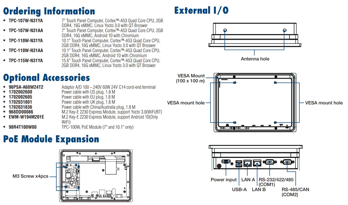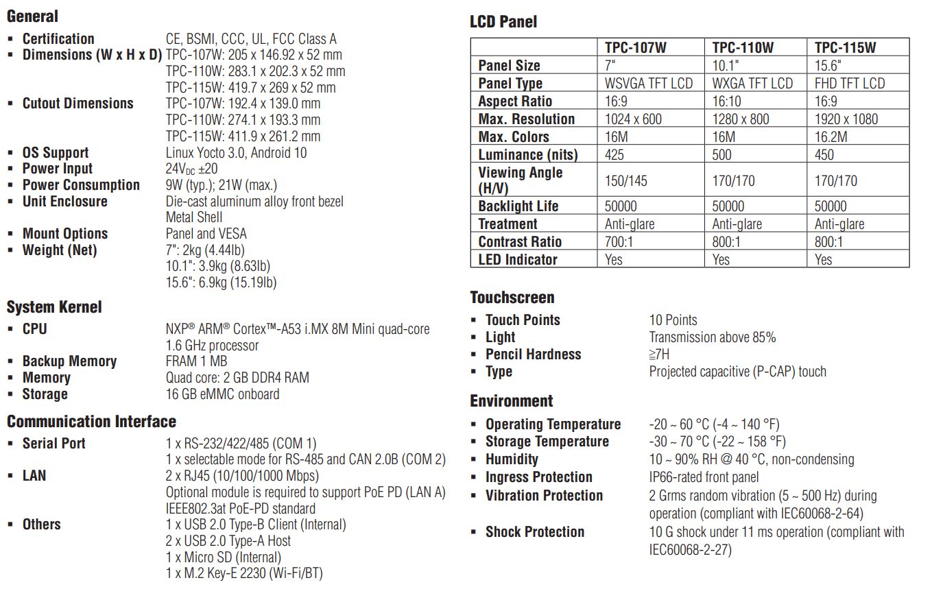 TPC-107W ist mit einem NXP® Cortex™-A53 i.MX 8M Mini Quad-Core-Prozessor ausgestattet. Für den webbasierten Betrieb bietet TPC-107W zwei 10/100/1000 LANs, von denen eines den IEEE 802.3 PoE-PD-Standard unterstützt. Die Integration von VNC und Browsern ermöglicht die schnelle Entwicklung von Webanwendungen und eine einfache Konfiguration.
