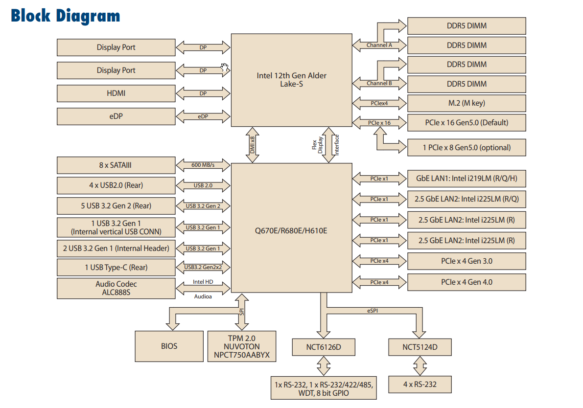- Supports Intel® 12th Gen Core™ processors (Alder Lake-S) with Q670E/