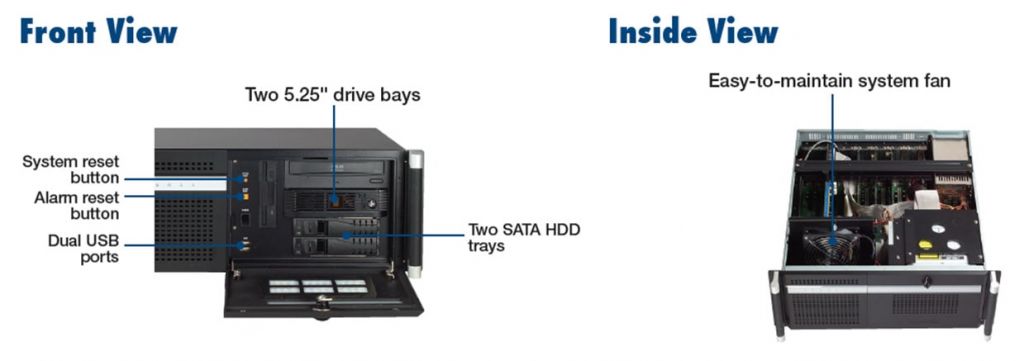 Die Vorderklappe vom ACP-4320 Rackmount-Gehäuse wird nach unten aufgeklappt, um auf die Schnittstellen des PC zuzugreifen. Auf der linken Seite findet man zwei USB 2.0 Anschlüsse. Die Festplatten sitzen auf einer Schiene für einen Schnellwechsel. Von hinten sind die Anschlüsse, das Mainboard zugänglich, um die herkömmlichen Geräte wie Maus, Tastatur usw. anzuschließen. Ein Laufwerk auf der rechten Seite für Software Installation oder ähnliches ist ebenfalls eingebaut. Die Status LEDs zeigen den aktuellen Status von der Stromversorgung, der Festplatten, Temperatur, Lüfter, LAN 1 und LAN 2 an. Des Weiteren besitzt das Gehäuse ein Alarm der bei Systemfehler ausgelöst wird, diesen kann man direkt an dem Gehäuse hinter der Vorderklappe deaktivieren.